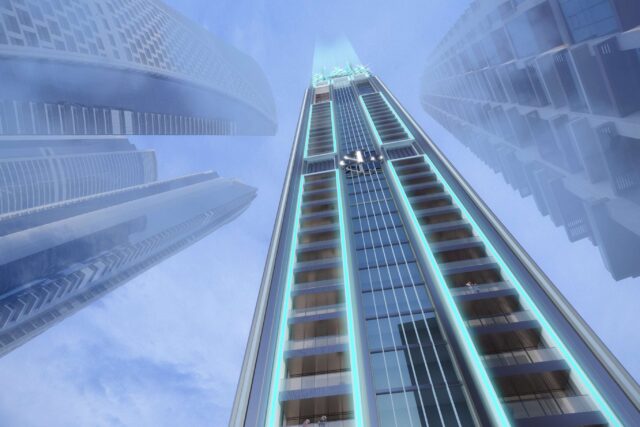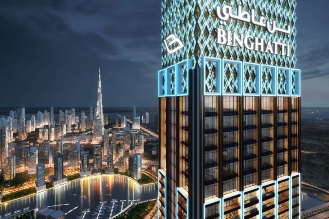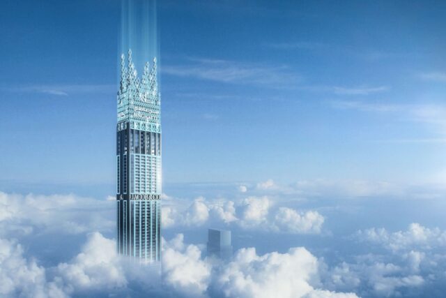 Burj Binghatti – Jacob & Co Residences is a luxury skyscraper in Business Bay, designed with a diamond-inspired crown, making it one of the tallest residential towers.